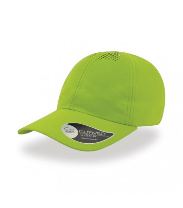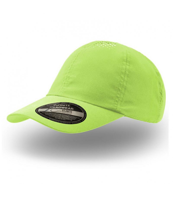 100% poliestere, cappellino 6 pannelli con parte alta traforata, pannello frontale non strutturato, visiera precurvata, chiusura con velcro, nessun occhiello, parasudore in poliestere mesh. gr 53