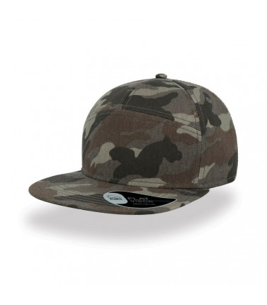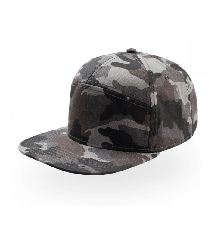 100% cotone. 5 pannelli, occhielli ricamati, visiera piatta, pannello frontale rinforzato, chiusura in pvc, 6 cuciture su visiera, parasudore in cotone.