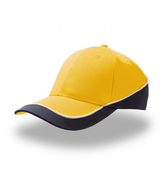 cappellino tipo baseball, 35% cotone 65% poliestere. linea aereodinamica. due colori abbinati con profilo a contrasto. chiusura con cinturino in tessuto e velcro.