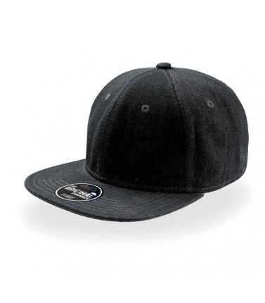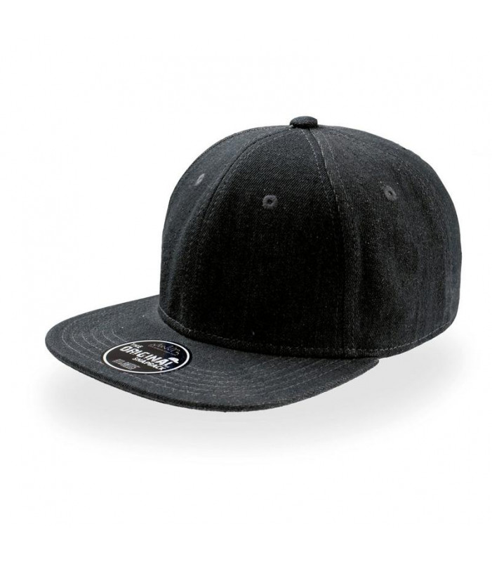 100% cotone denim. 6 pannelli, occhielli ricamati, visiera piatta, pannello frontale rinforzato, chiusura in pvc, 6 cuciture su visiera, parasudore in cotone.