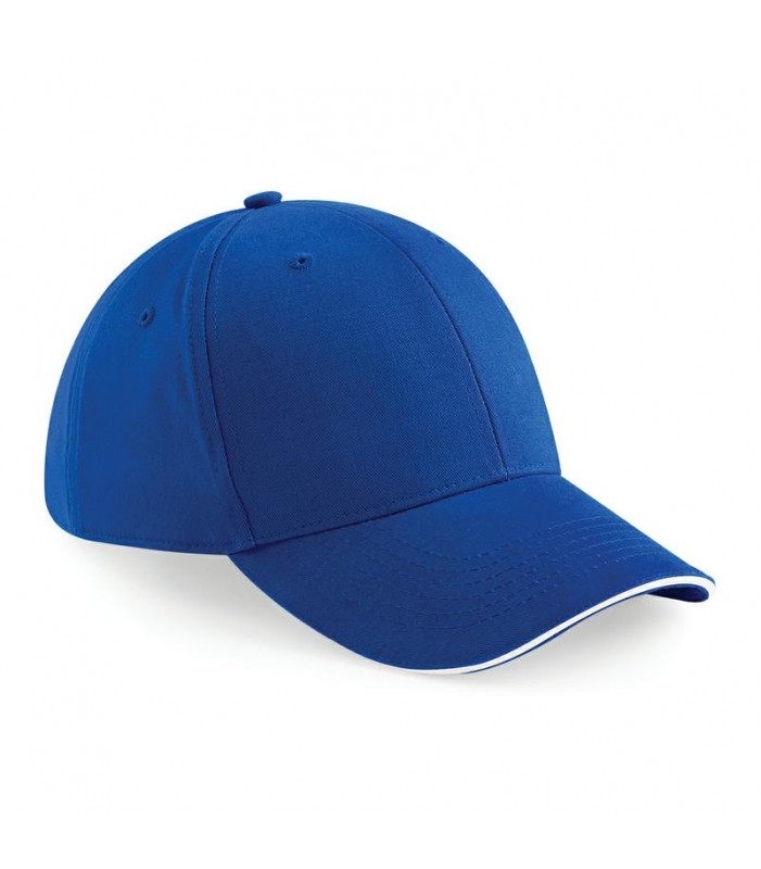cappellino 6 pannelli, 100% cotone pettinato, visiera precurvata con sandwich con colori a contrasto. pannelli frontali strutturati, chiusura con fibbia e occhiello satinato. etichetta strappabile.