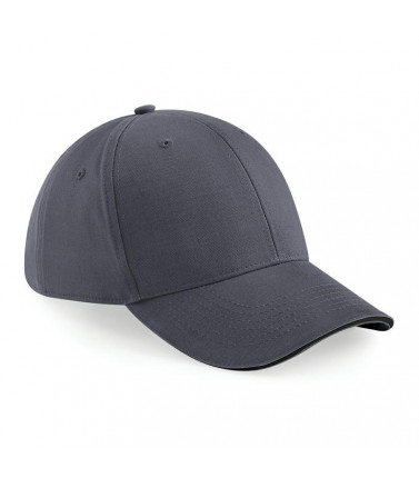 cappellino 6 pannelli, 100% cotone pettinato, visiera precurvata con sandwich con colori a contrasto. pannelli frontali strutturati, chiusura con fibbia e occhiello satinato. etichetta strappabile.