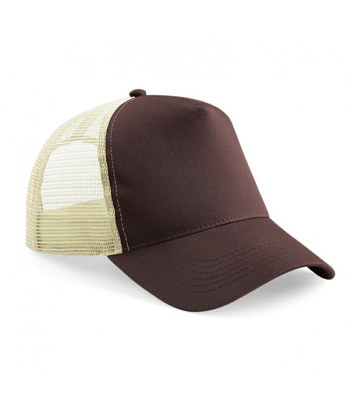 pannello frontale bianco 100% cotone, pannello posteriore in tinta con visiera 100% poliestere. regolazione con snap-tab. perfetto per stampa e ricamo. nel colore choc, pannello e visiera chocolate, pannello posteriore caramel.