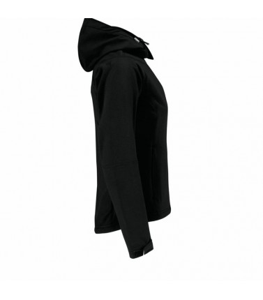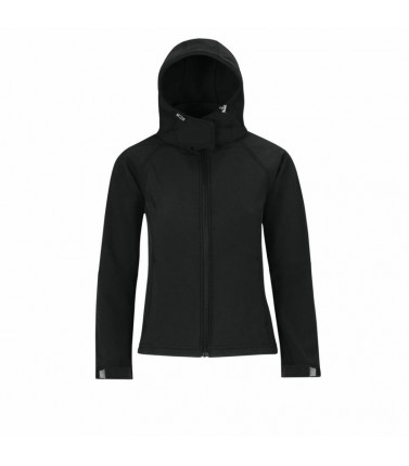 giacca tecnica, esterno 94% polyestere 6% elastane. tessuto triplo strato (esterno softshell, interno traspirante, fodera micro-fleece) interno 100% poliestere. taglio femminile, maniche taglio raglan, cappuccio removibile per mezzo di zip e regolabile co