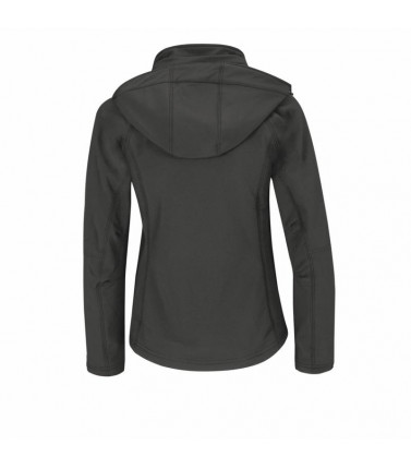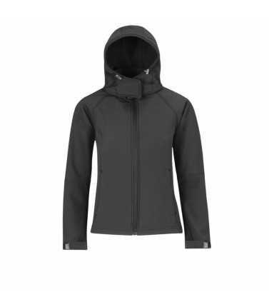 giacca tecnica, esterno 94% polyestere 6% elastane. tessuto triplo strato (esterno softshell, interno traspirante, fodera micro-fleece) interno 100% poliestere. taglio femminile, maniche taglio raglan, cappuccio removibile per mezzo di zip e regolabile co