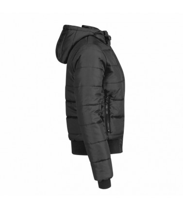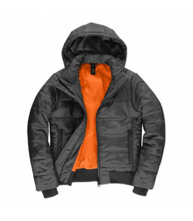 giacca imbottita stile bomber, esterno 100% poliestere taffeta impermeabile, imbottitura interna 100% poliestere cotton feel. cappuccio imbottito regolabile e removibile. colletto sostenuto e fodera interna con colore a contrasto per un look piu' moderno.