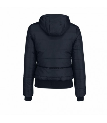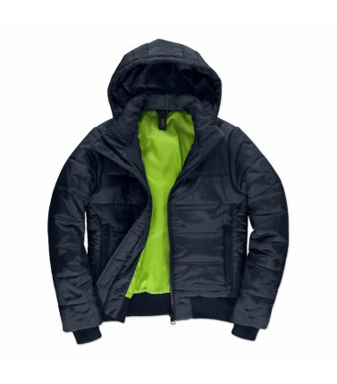giacca imbottita stile bomber, esterno 100% poliestere taffeta impermeabile, imbottitura interna 100% poliestere cotton feel. cappuccio imbottito regolabile e removibile. colletto sostenuto e fodera interna con colore a contrasto per un look piu' moderno.