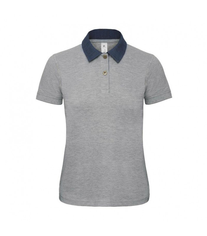 polo maniche corte 100% cotone piquet, colletto e bottoniera in denim con due bottoni in ottone anticato. cuciture a contrasto. taglio femminile.