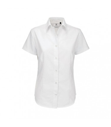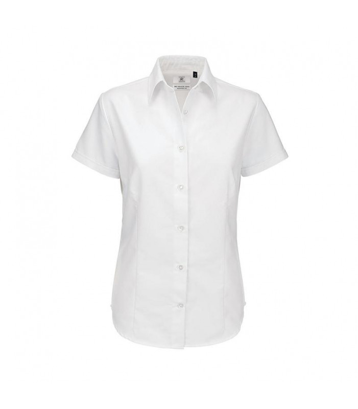 70% cotone pettinato, 30% poliestere. tessuto oxford con rifiniture facili da stirare. elegante colletto con taglio femminile. finiture con pieghe sul retro e sul davanti per un taglio più aderente. bottoni cuciti a croce con effetto madreperla che accopp