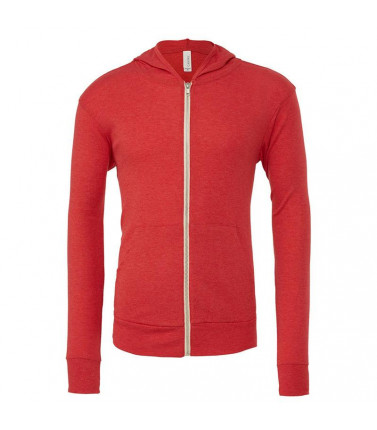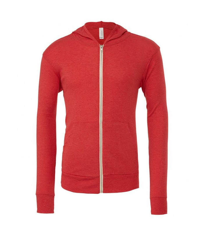 felpa unisex, in tessuto 'triblend': 50% poliestere, 25% cotone pettinato e ring-spun, 25% rayon. tessuto leggero 190 gr, appositamente progettato con una superficie liscia, ideale per la stampa. zip intera, cappuccio senza cordini, tasche a marsupio. cuc