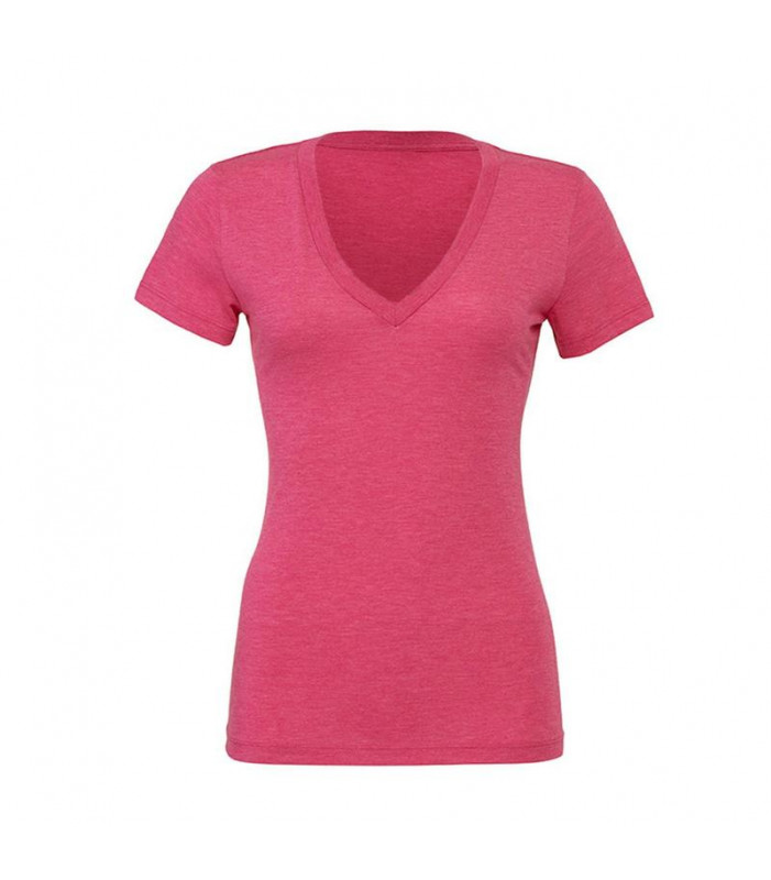 t-shirt con profondo collo a v, 115 gr. in tessuto 'triblend': composto da 50% poliestere, 25% cotone pettinato e ring-spun, 25% rayon. cuciture laterali, vestibilità moderna femminile dalla linea più lunga.