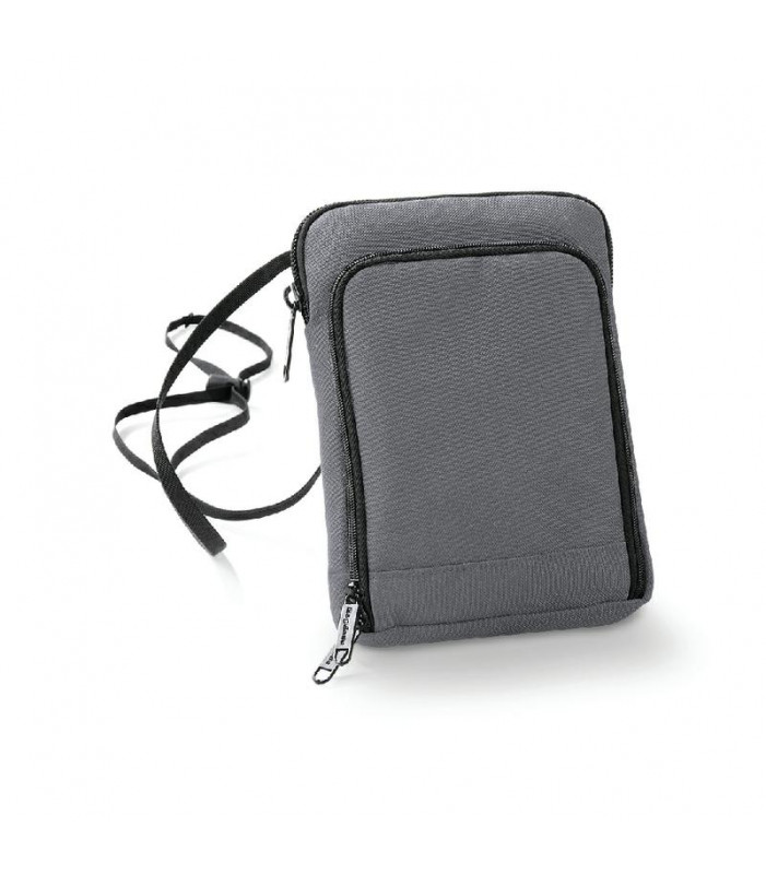 600d poliestere. portafoglio da viaggio, dotato di organizer con tasca per passaporto e scomparto imbottito compatibile con le dimensioni degli smartphone. cordicella per portarlo al collo. dimensioni bxhxp: 19x14x2 cm.