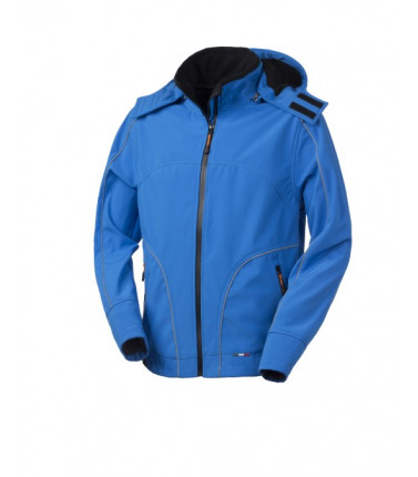 Chiusura con cerniera centrale antipioggia, 2 tasche inferiori chiuse con cerniera antipioggia, 1 taschino interno al petto destro chiuso con cerniera, polsi interni in maglia elastica, coulisse di chiusura al fondo, fondo posteriore arrotondato con inserti di colore a contrasto, cappuccio con coulisse e velcro di chiusura applicato al giubbotto tramite cerniera, fori di aerazione sotto le ascelle e su schiena, profili rifrangenti anteriori, posteriori e lungo le maniche. tessuto 94% poliestere 6% spandex