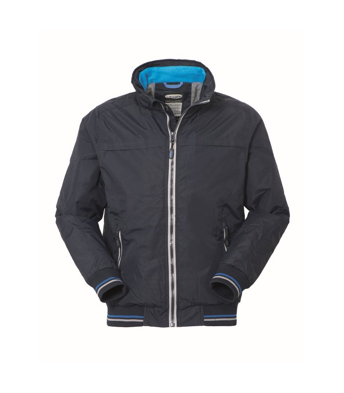 Chiusura con cerniera centrale, 2 tasche inferiori a filetto chiuse con cerniera, 1 taschino interno verticale al petto destro chiuso con cerniera, polsi e fascia in vita in maglia elastica con profili di colore a contrasto, foro di aerazione su schiena, collo invernale con ovatta e interno del collo in micropile