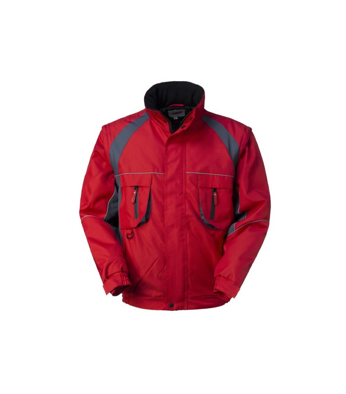 Chiusura con cerniera centrale coperta da patella chiusa con punti velcro e bottoni automatici, maniche staccabili, 2 tasche inferiori a filetto chiuse con patella antivento, 2 taschini con soffietto laterale applicati al petto chiusi con cerniera verticale e aletta, 1 taschino interno chiuso con punto velcro applicato al petto sinistro, polsi al fondo manica con elastico regolabili con velcro, elastico ai fianchi, cappuccio con coulisse di chiusura inserito nel collo chiuso con velcro, interno del collo in pile, inserti di colore a contrasto lungo i fianchi e le maniche con profilo rifrangente grigio.