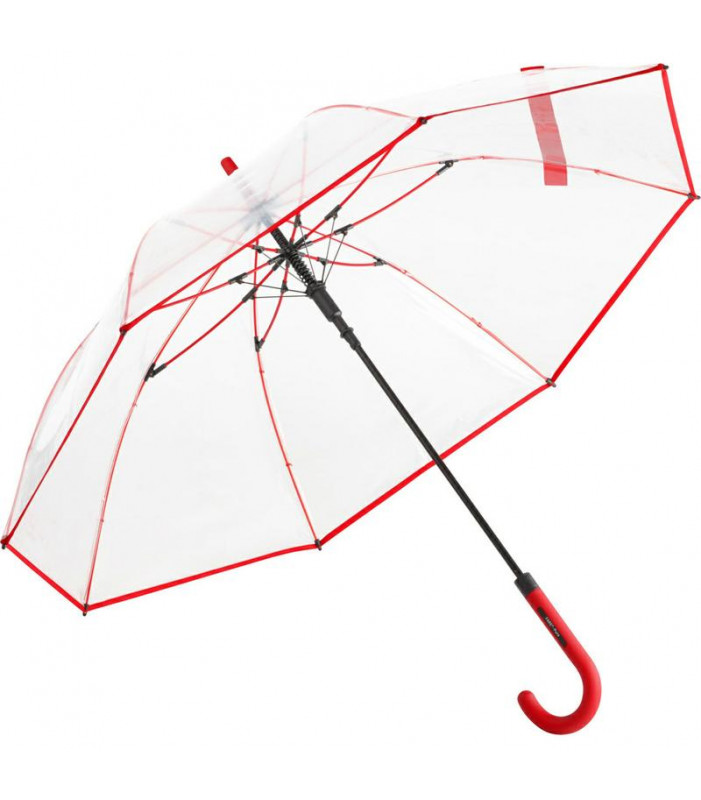 ombrello trasparente con dettagli colorati, apertura automatica, sistema windproof, stecche in fibra di vetro flessibili, elementi di design abbinati nel colore, manico a uncino soft-touch delicato con tasto di azionamento integrato e possibilità di appli