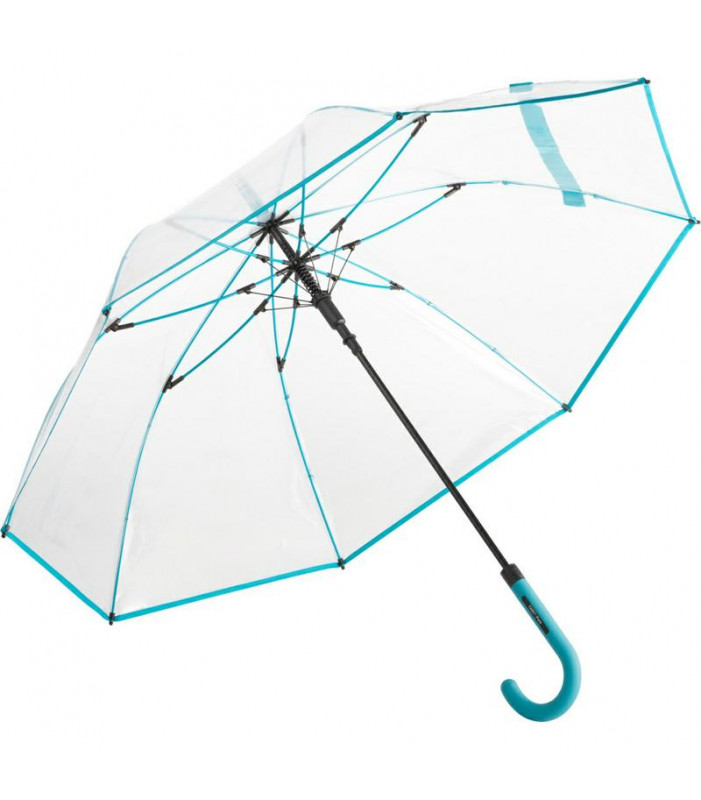 ombrello trasparente con dettagli colorati, apertura automatica, sistema windproof, stecche in fibra di vetro flessibili, elementi di design abbinati nel colore, manico a uncino soft-touch delicato con tasto di azionamento integrato e possibilità di appli