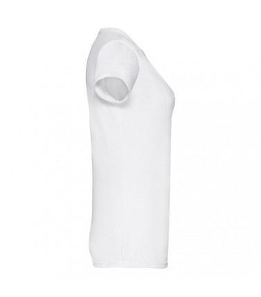 100% cotone girocollo, cuciture laterali sagomate per un taglio piu' femminile, tessitura compatta per un processo di stampa piu' pulito. heather grey: 97% cotone, 3% poliestere. bianco: 135 gr