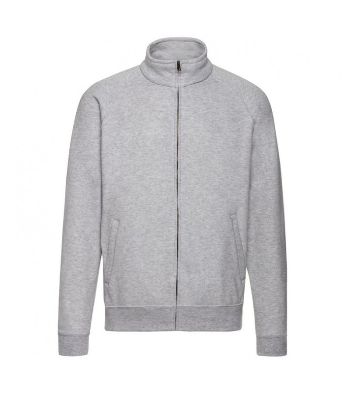 80% cotone, 20% poliestere, collo a lupetto, zip lunga e sottile, due tasche davanti, cerniera nascosta per favorire la stampa, felpata internamente.