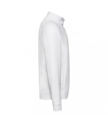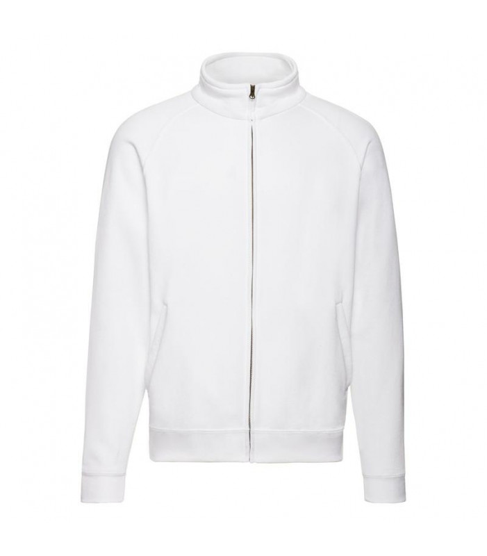 80% cotone, 20% poliestere, collo a lupetto, zip lunga e sottile, due tasche davanti, cerniera nascosta per favorire la stampa, felpata internamente.