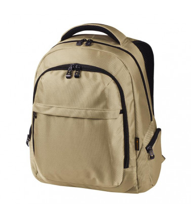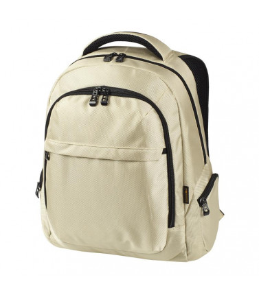 zaino porta-notebook elaborato, scomparto principale con scomparto notebook imbottito e tasca, tasca anteriore ampia e imbottita, con cerniera e diverse tasche, portachiavi e tasca portacellulare, tasca anteriore con cerniera, tasche laterali con cerniera. dim. bxhxp: 30x43x14. area di stampa: 16 x 16 cm.