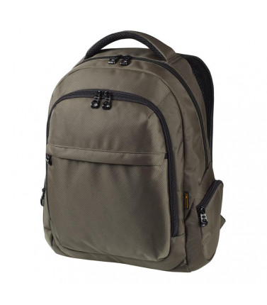 zaino porta-notebook elaborato, scomparto principale con scomparto notebook imbottito e tasca, tasca anteriore ampia e imbottita, con cerniera e diverse tasche, portachiavi e tasca portacellulare, tasca anteriore con cerniera, tasche laterali con cerniera. dim. bxhxp: 30x43x14. area di stampa: 16 x 16 cm.