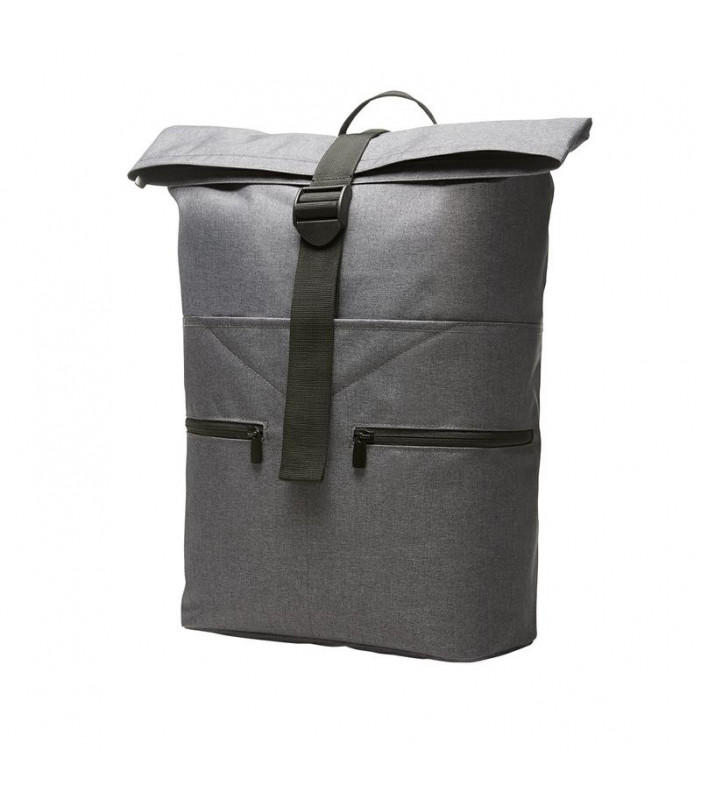 zaino con patta e con innovativo sistema di chiusura, capiente scomparto principale con taschino a chiusura lampo pendente, scomparto imbottito per notebook, 2 tasche anteriori con chiusura lampo, schienale imbottito e cintura, manico