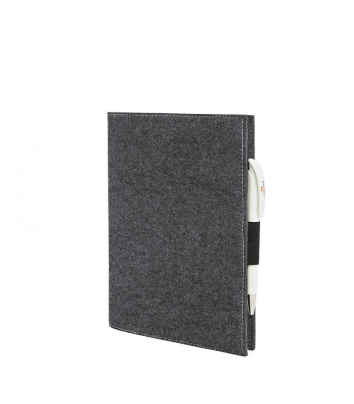pregiata custodia in feltro adatta a quaderno formato a5, portapenna come chiusura. dimensioni: 17 x 23 x 1 cm. area personalizzabile: 7,5 x 18 cm sul fronte.