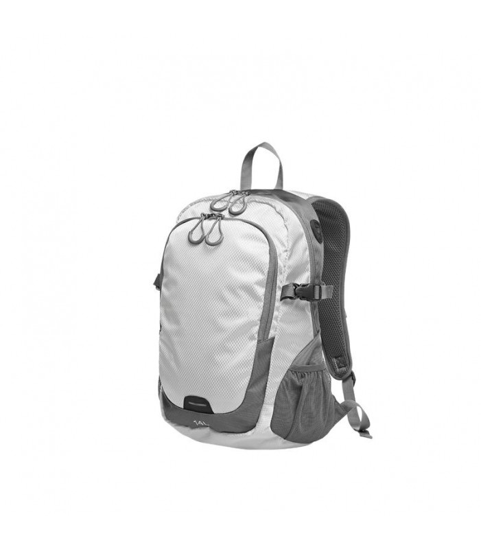100% poliestere 420d & ripstop. zaino con ampio vano principale interno, cinghie laterali di attacco, tasca anteriore a zip con due scomparti inseribili, scomparti retinati laterali, tracolle imbottite con fascia toracica elastica regolabile. dimensioni: 30 x 42 x 14 cm, capacita': 14 litri, area di stampa: 11 x 18 cm.