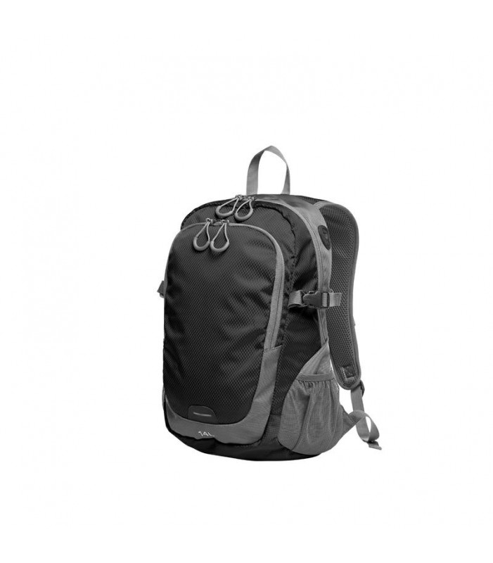 100% poliestere 420d & ripstop. zaino con ampio vano principale interno, cinghie laterali di attacco, tasca anteriore a zip con due scomparti inseribili, scomparti retinati laterali, tracolle imbottite con fascia toracica elastica regolabile. dimensioni: 30 x 42 x 14 cm, capacita': 14 litri, area di stampa: 11 x 18 cm.