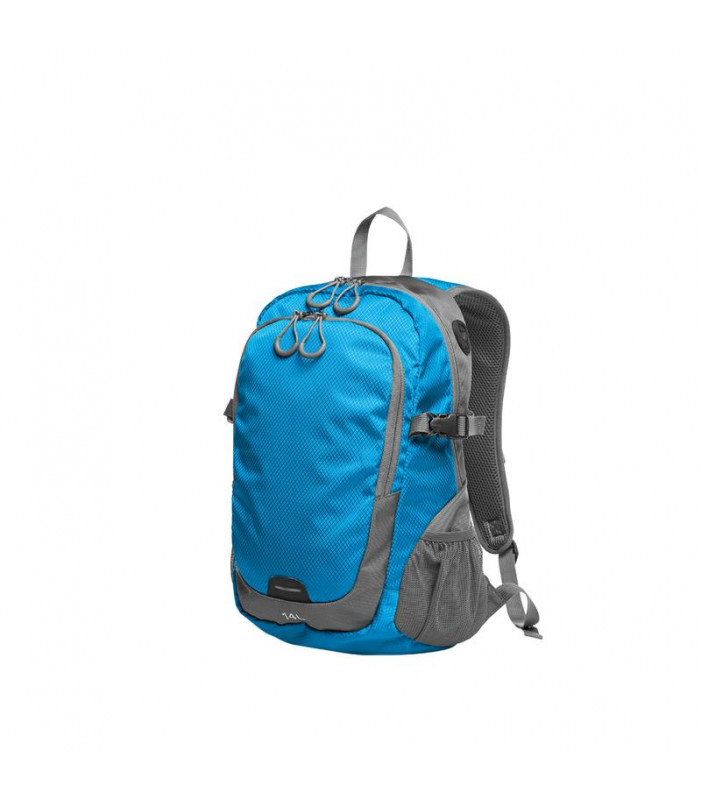 100% poliestere 420d & ripstop. zaino con ampio vano principale interno, cinghie laterali di attacco, tasca anteriore a zip con due scomparti inseribili, scomparti retinati laterali, tracolle imbottite con fascia toracica elastica regolabile. dimensioni: 30 x 42 x 14 cm, capacita': 14 litri, area di stampa: 11 x 18 cm.