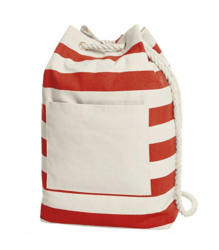 100% cotone. sacca con decoro a strisce, spaziosa, con retro rigido, ampia tasca anteriore con chiusura in velcro, occhielli decorativi e tracolla in corda spessa di cotone. area stampabile sulla tasca frontale: 17 x 13 cm. dimensioni: 30 x 48 x 15 cm. capacitã : 22 litri.