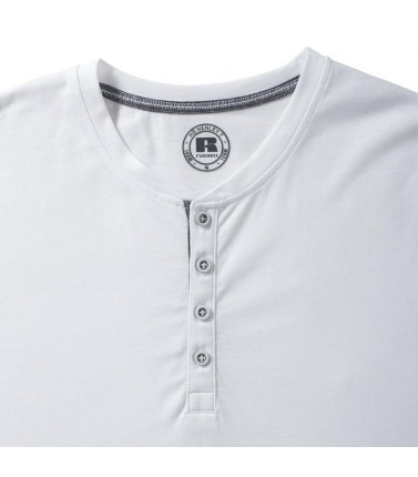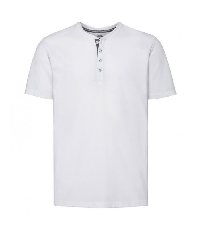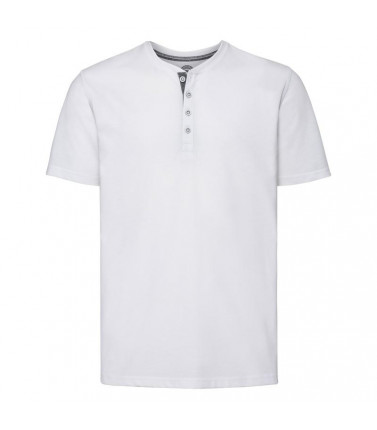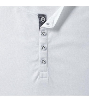 65% poliestere, 35% cotone pettinato ring-spun. t-shirt da uomo con cuciture decorative e abbottonatura interna sotto fodera in denim, cuciture laterali, cuciture su spalle e giromanica, vestibilitã slim, bottoni con colori a contrasto. (col. 30 155g/m)
