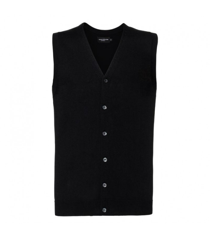 50% cotone, 50% acrilico. cardigan uomo smanicato con scollo a v, elastam su polsini e girovita, abbottonatura ricercata con rivestimento interno e bottoni in tinta, dettagli aderenti su scollo a v, giromaniche e spalle.