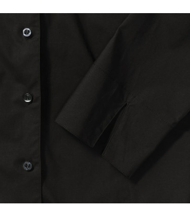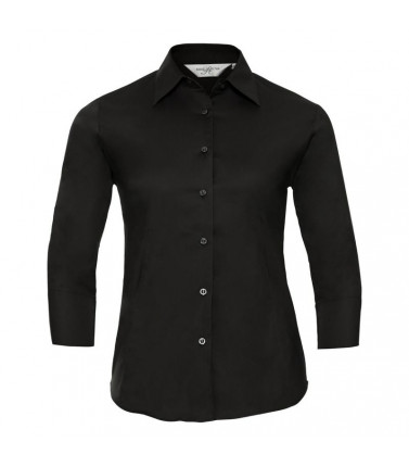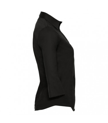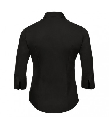 97% cotone, 3% elastane. elegante collettosemiaperto con bottone singolo perlato, orlostondato. manica 3/4 con spacchetto e risvolto.pince dietro, davanti e al seno per unavestibilità femminile. bottone di riserva.