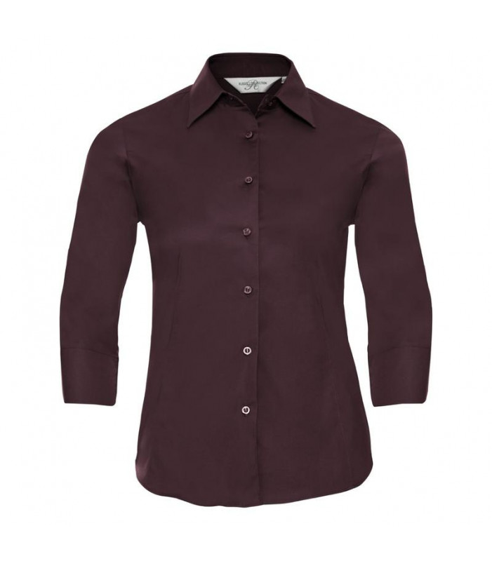97% cotone, 3% elastane. elegante collettosemiaperto con bottone singolo perlato, orlostondato. manica 3/4 con spacchetto e risvolto.pince dietro, davanti e al seno per unavestibilità femminile. bottone di riserva.