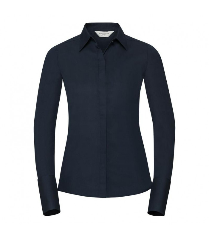 75% cotone 25% elastomultiestere (fibra di lycra® t400®). camicia leasticizzata da donna, tessuto resistente e durevole dalla perfetta vestibilità, pence sul retro, colletto alla semi-francese basso, pattina stretta e polsini squadrati, controllo dell'umi