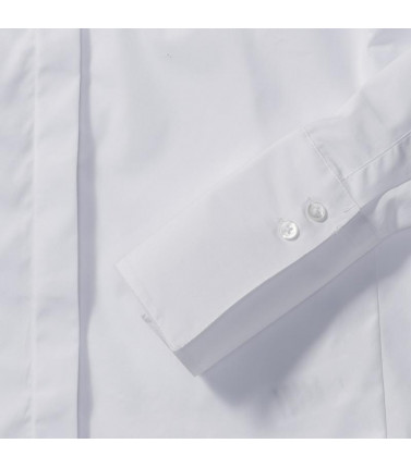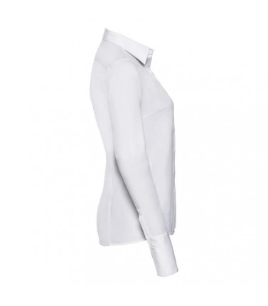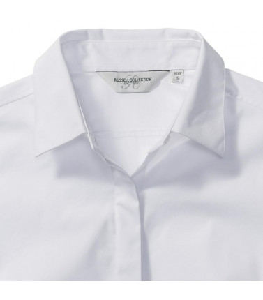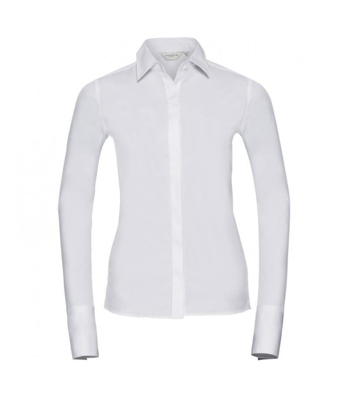 75% cotone 25% elastomultiestere (fibra di lycra® t400®). camicia leasticizzata da donna, tessuto resistente e durevole dalla perfetta vestibilità, pence sul retro, colletto alla semi-francese basso, pattina stretta e polsini squadrati, controllo dell'umi