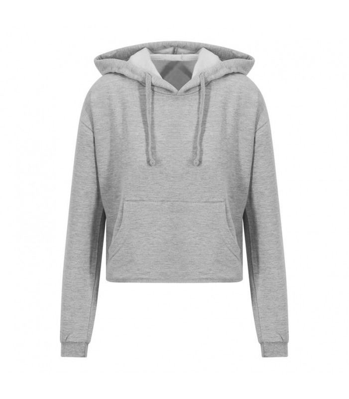 80% cotone ringspun, 20% poliestere. felpa da donna con cappuccio dal taglio corto, tasca a marsupio, cucitura doppia, orlo a taglio vivo con cuciture a vista, cappuccio in tessuto doppio, cordini in pizzo, tessuto ideale per la stampa, etichetta strappabile.