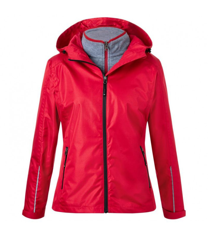 100% poliestere. giacca 3 in 1, tessuto resistente al vento e all'acqua (colonna d'acqua di 5.000 mm), traspirante e permeabile al vapore (5.000 g/mâ²/24 h), cuciture nastrate, antimacchia grazie al bionic-finishâ®eco. cappuccio regolabile, cerniera frontale nascosta con protezione per il mento, 2 tasche laterali con zip, 1 tasca interna. dettagli riflettenti sulla manica e sul retro. parte interna in pile con bordino in contrasto. leggermente sfiancata.