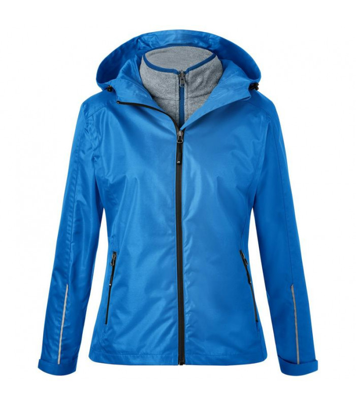 100% poliestere. giacca 3 in 1, tessuto resistente al vento e all'acqua (colonna d'acqua di 5.000 mm), traspirante e permeabile al vapore (5.000 g/mâ²/24 h), cuciture nastrate, antimacchia grazie al bionic-finishâ®eco. cappuccio regolabile, cerniera frontale nascosta con protezione per il mento, 2 tasche laterali con zip, 1 tasca interna. dettagli riflettenti sulla manica e sul retro. parte interna in pile con bordino in contrasto. leggermente sfiancata.
