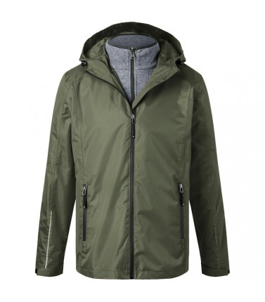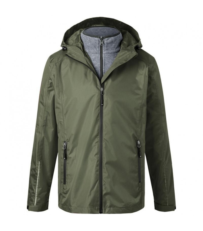 100% poliestere. giacca 3 in 1, tessuto resistente al vento e all'acqua (colonna d'acqua di 5.000 mm), traspirante e permeabile al vapore (5.000 g/mâ²/24 h), cuciture nastrate, idrorepellente e antimacchia grazie al bionic-finishâ®eco. cappuccio regolabile, cerniera frontale nascosta con protezione per il mento, 2 tasche laterali con zip, 1 tasca interna. tutte le cerniere sono impermeabili. dettagli riflettenti sulla manica e sul retro. parte interna in pile con bordino in contrasto, 2 tasche laterali, collo alto.