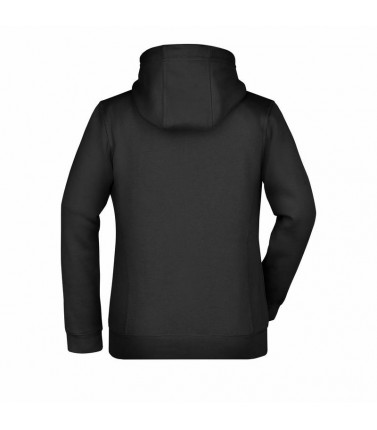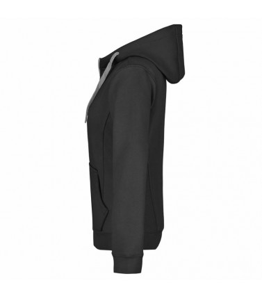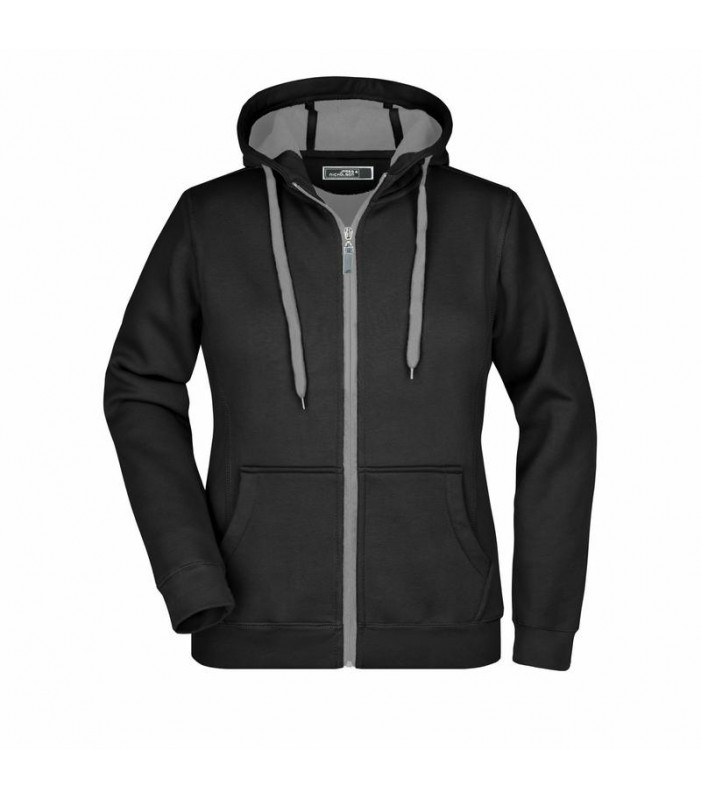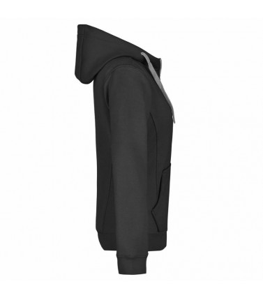 55% poliestere, 45% cotone. felpa giacca sportiva con cappuccio. zip intera, cordino e interno a colore a contrasto. polsini e girovita con elastane, tasche a marsupio. taglio femminile.
