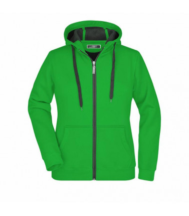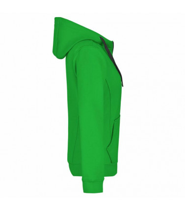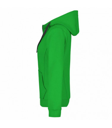 55% poliestere, 45% cotone. felpa giacca sportiva con cappuccio. zip intera, cordino e interno a colore a contrasto. polsini e girovita con elastane, tasche a marsupio. taglio femminile.