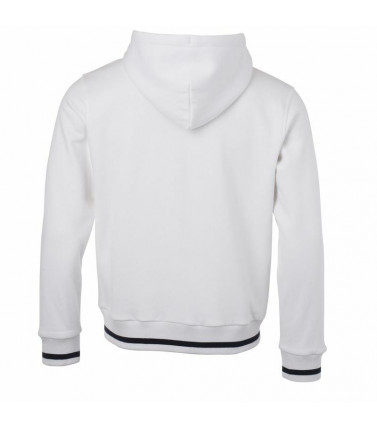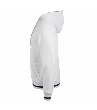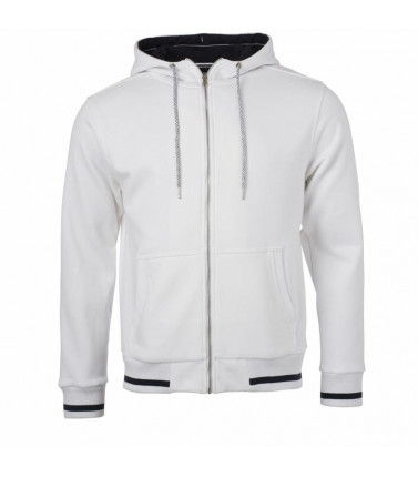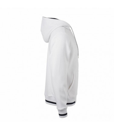 giacca con cappuccio e cerniera. tessuto esterno (300 g/mâ²): 80% cotone, 20% poliestere. tessuto morbido e di alta qualitã , internamente sgarzato, polsini a maglia di elastan, strisce contrastanti nei polsini e in vita, cappuccio a due strati contrastanti, cerniera metallica ykk, tasca a canguro.