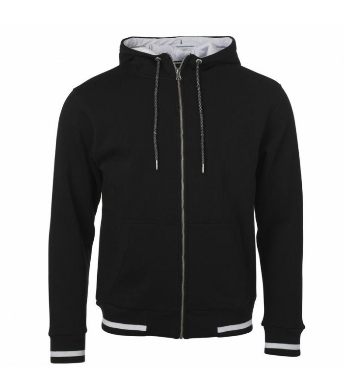giacca con cappuccio e cerniera. tessuto esterno (300 g/mâ²): 80% cotone, 20% poliestere. tessuto morbido e di alta qualitã , internamente sgarzato, polsini a maglia di elastan, strisce contrastanti nei polsini e in vita, cappuccio a due strati contrastanti, cerniera metallica ykk, tasca a canguro.