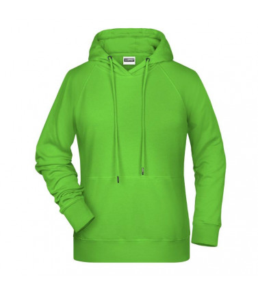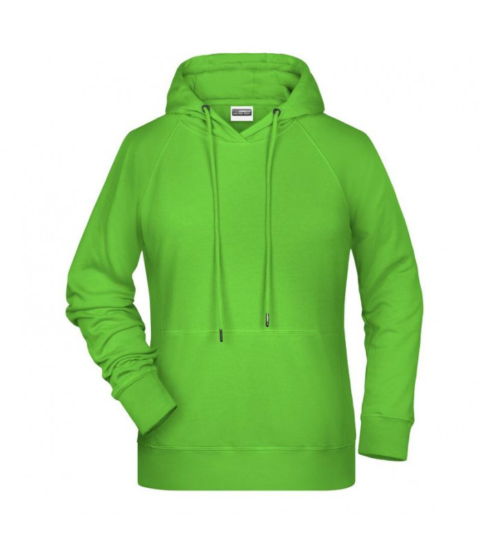 85% cotone organico, 15% poliestere. felpa da donna in tessuto di alta qualitã , cappuccio a due strati con coulisse, cuciture laterali divisorie sul davanti, tasca a canguro, cinturini con elastan, etichetta a strappo, leggermente sfiancata.