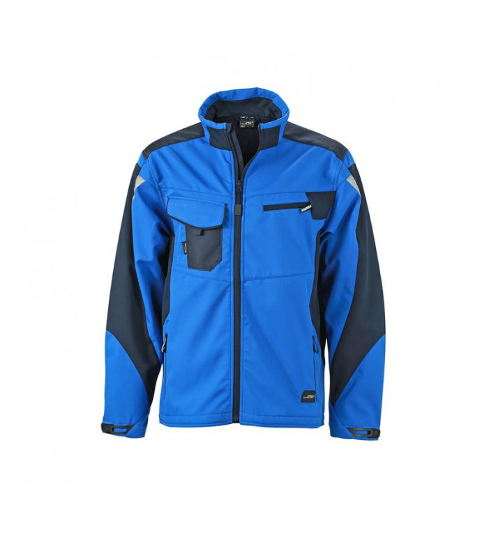 100% poliestere. giacca in softshell resistente al vento e all'acqua fino a 2000 mm, traspirante, colletto rigido, nastro di rinforzo alle spalle con cordura, cerniera intera foderata con guarnizione antivento. 2 tasche laterali con zip, 2 tasche pettorali di cui una con cerniera, tasche interne. dettagli catarifrangenti sulle maniche e sul dorso.