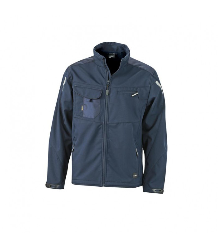 100% poliestere. giacca in softshell resistente al vento e all'acqua fino a 2000 mm, traspirante, colletto rigido, nastro di rinforzo alle spalle con cordura, cerniera intera foderata con guarnizione antivento. 2 tasche laterali con zip, 2 tasche pettorali di cui una con cerniera, tasche interne. dettagli catarifrangenti sulle maniche e sul dorso.