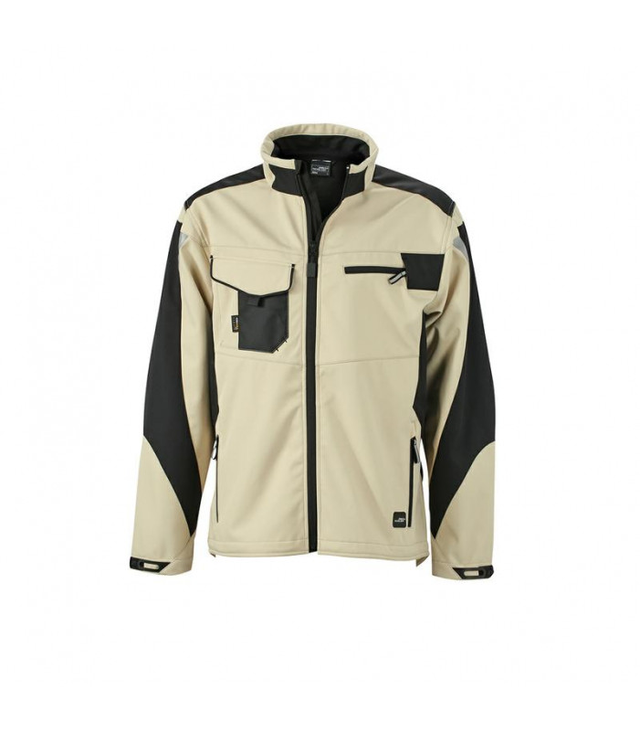 100% poliestere. giacca in softshell resistente al vento e all'acqua fino a 2000 mm, traspirante, colletto rigido, nastro di rinforzo alle spalle con cordura, cerniera intera foderata con guarnizione antivento. 2 tasche laterali con zip, 2 tasche pettorali di cui una con cerniera, tasche interne. dettagli catarifrangenti sulle maniche e sul dorso.